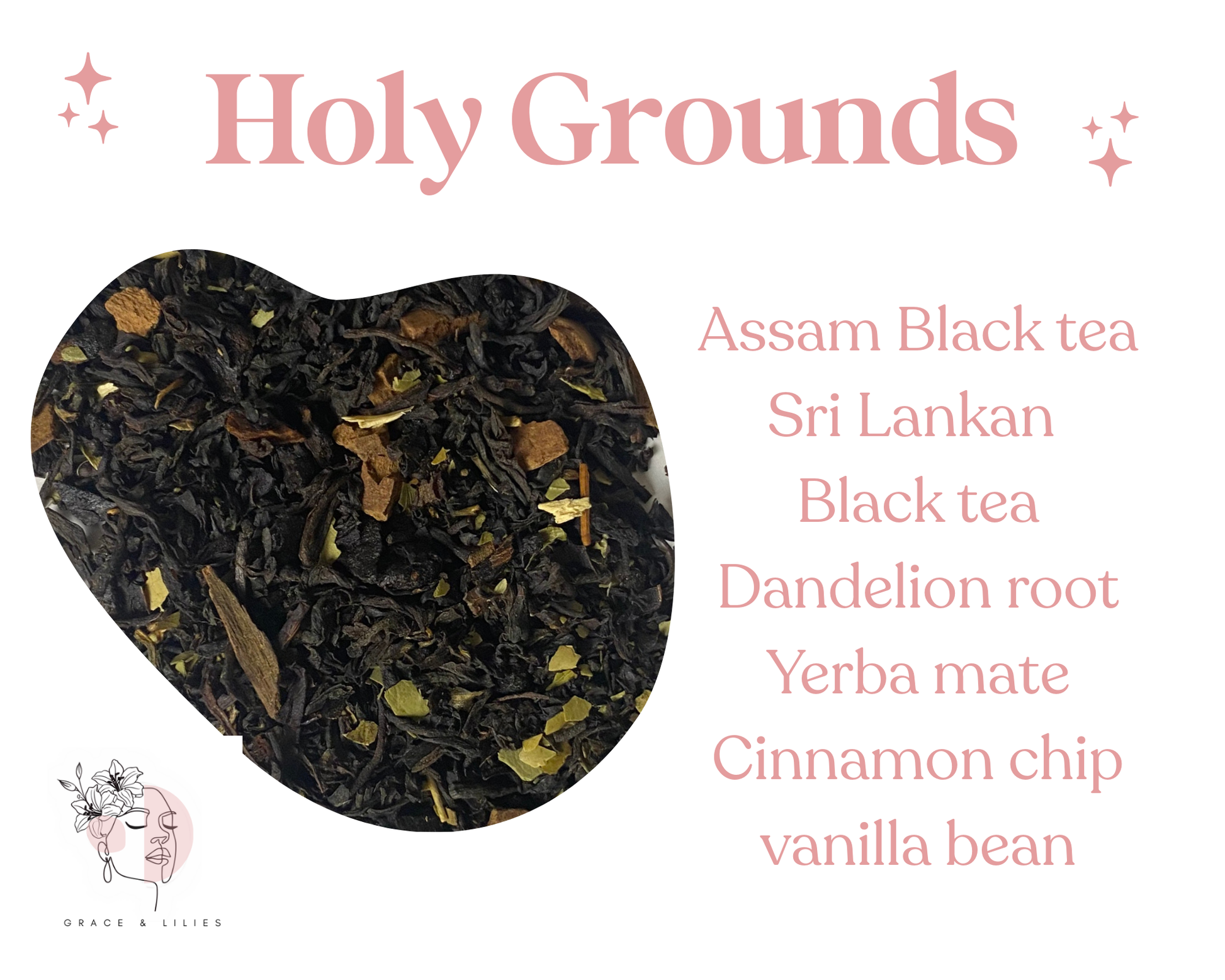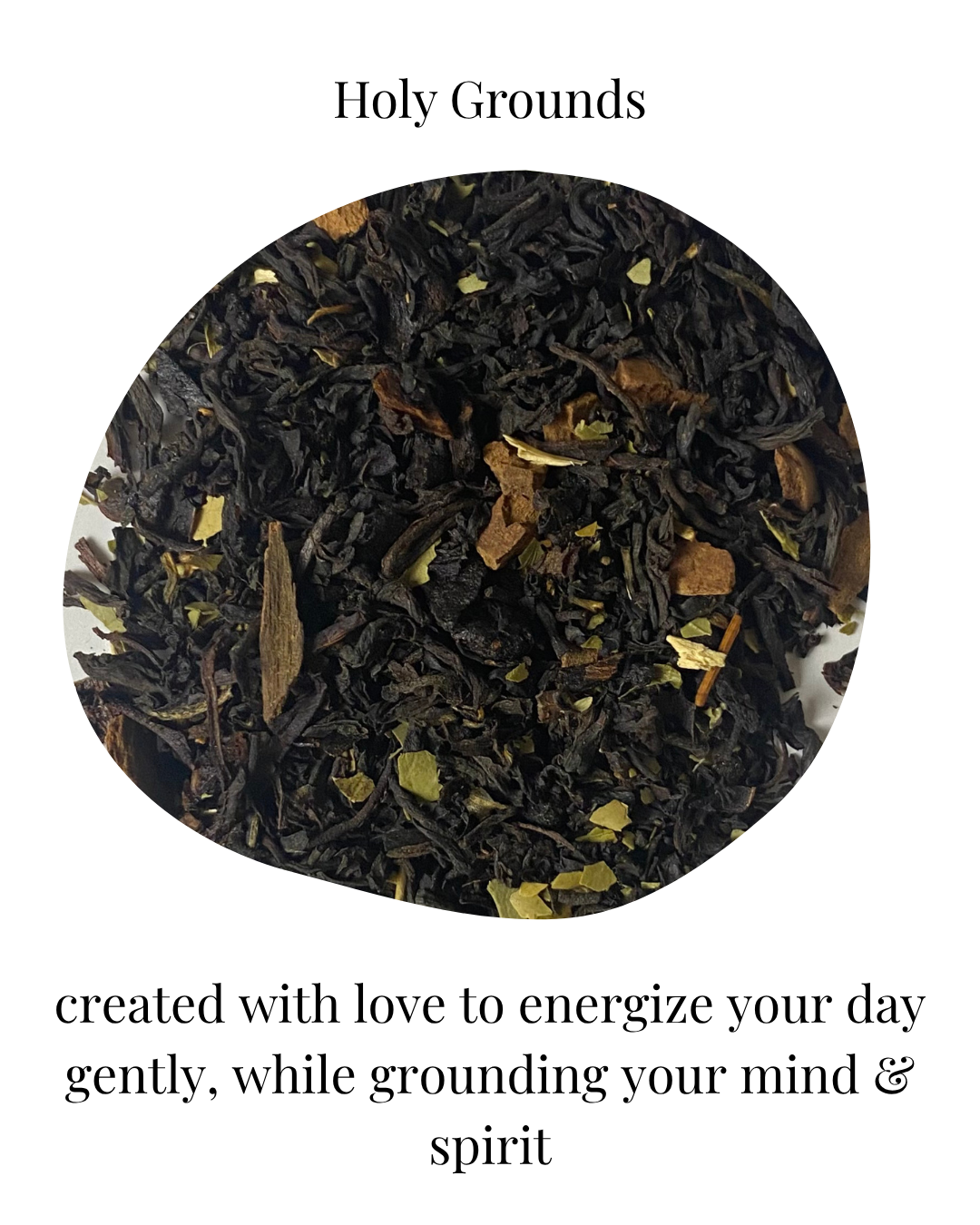 Meet your new morning ritual. Holy Grounds is a bold, smooth black tea blend designed to satisfy your coffee cravings without the jitters. Featuring English Breakfast tea (a rich mix of Assam, Ceylon, and Kenyan leaves), Assam Black tea, Sri Lankan Black tea, this comforting blend is elevated with warm cinnamon chips and sweet vanilla bean, and optional touches of carob and toasted coconut for a mocha-like finish. Perfect with milk and honey for a sweet morning pick-me-up that leaves you grounded in peace, not caffeine crashes.