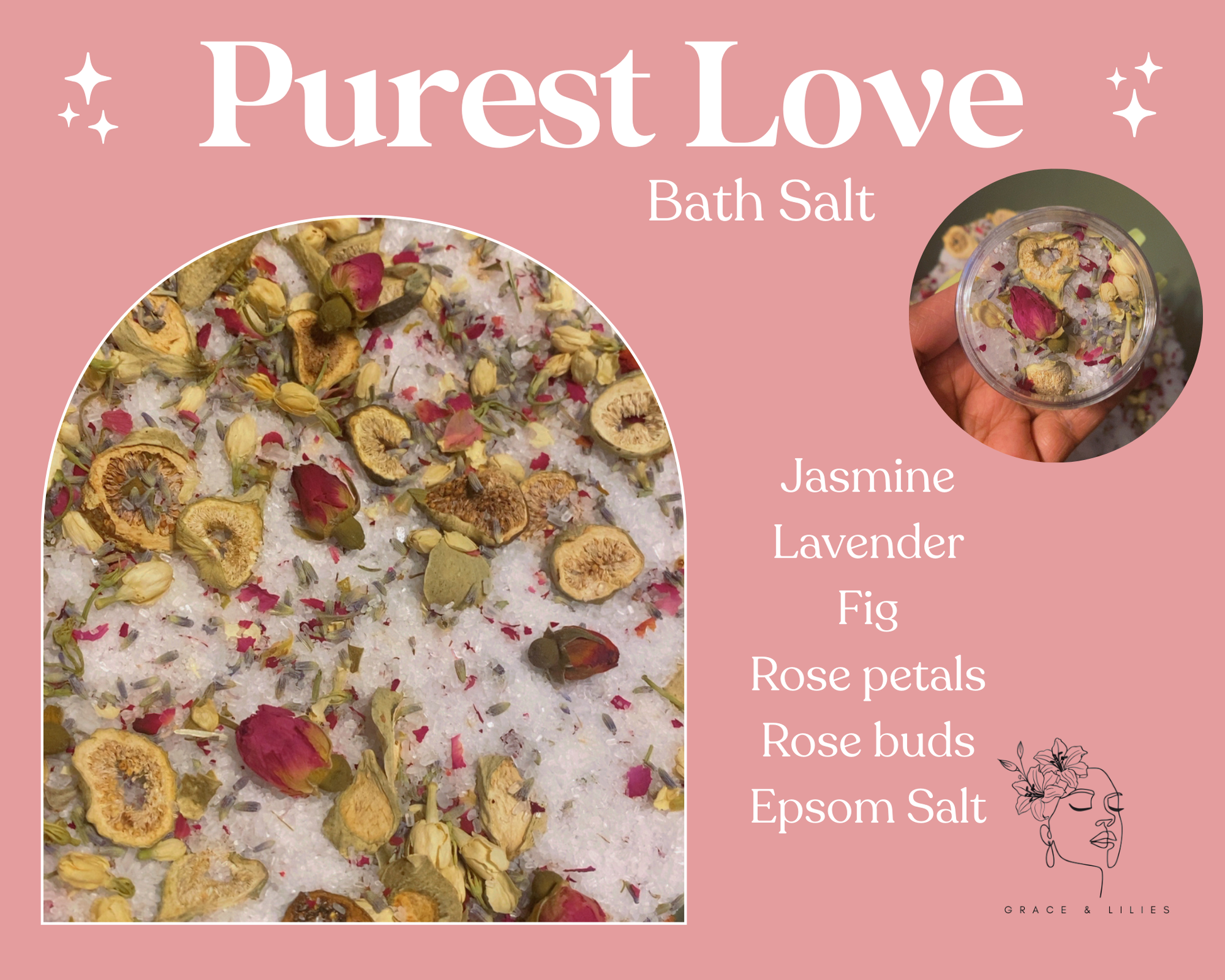 Purest Love is a blend of Jasmine, fig, Lavender, and rose petals to embrace you in the purest love, the kind God pours out daily. This soak whispers: you are seen, cherished, and deeply loved. This bath salt consists of natural bath salts and dried herbs.