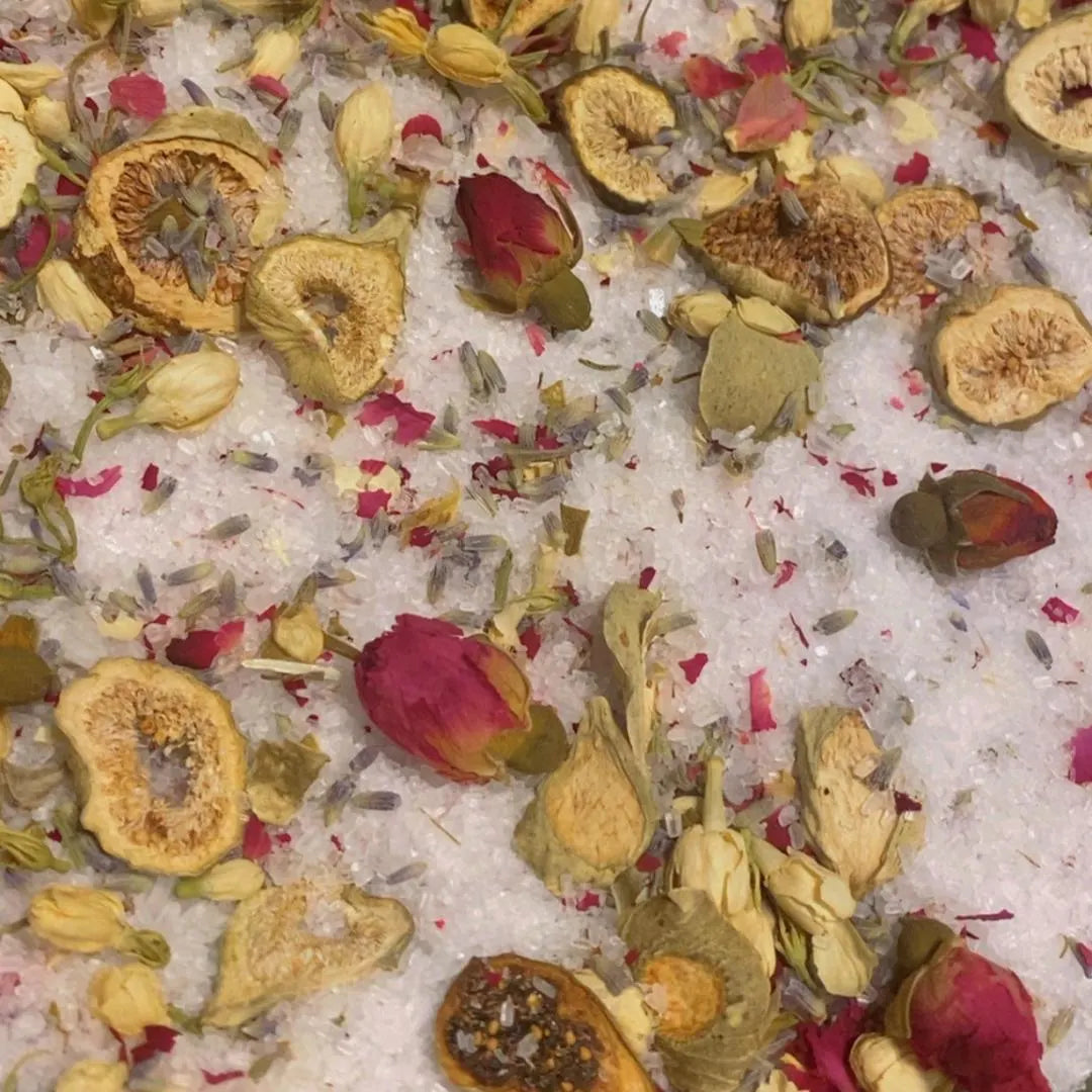 Epsom Salt, Jasmine flower, Dried Fig, Lavender, Rose petals, Rose Buds